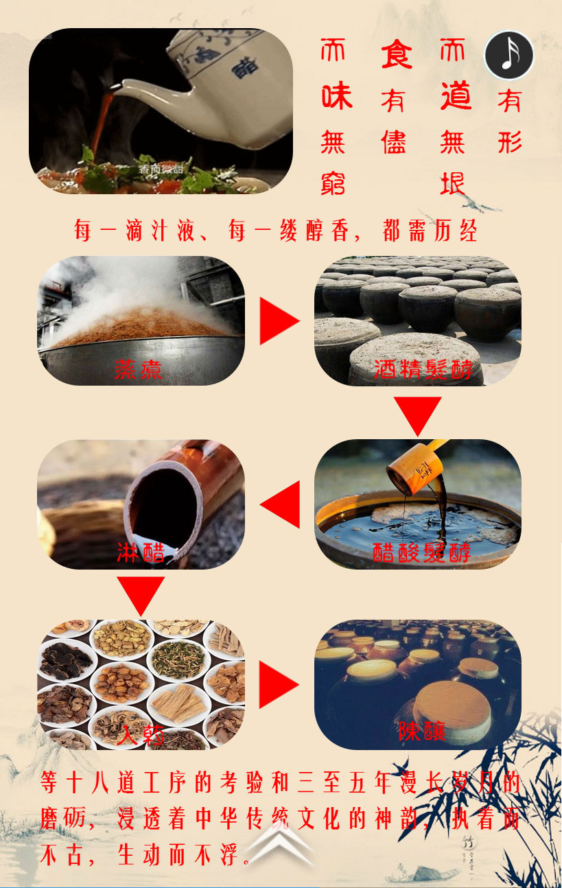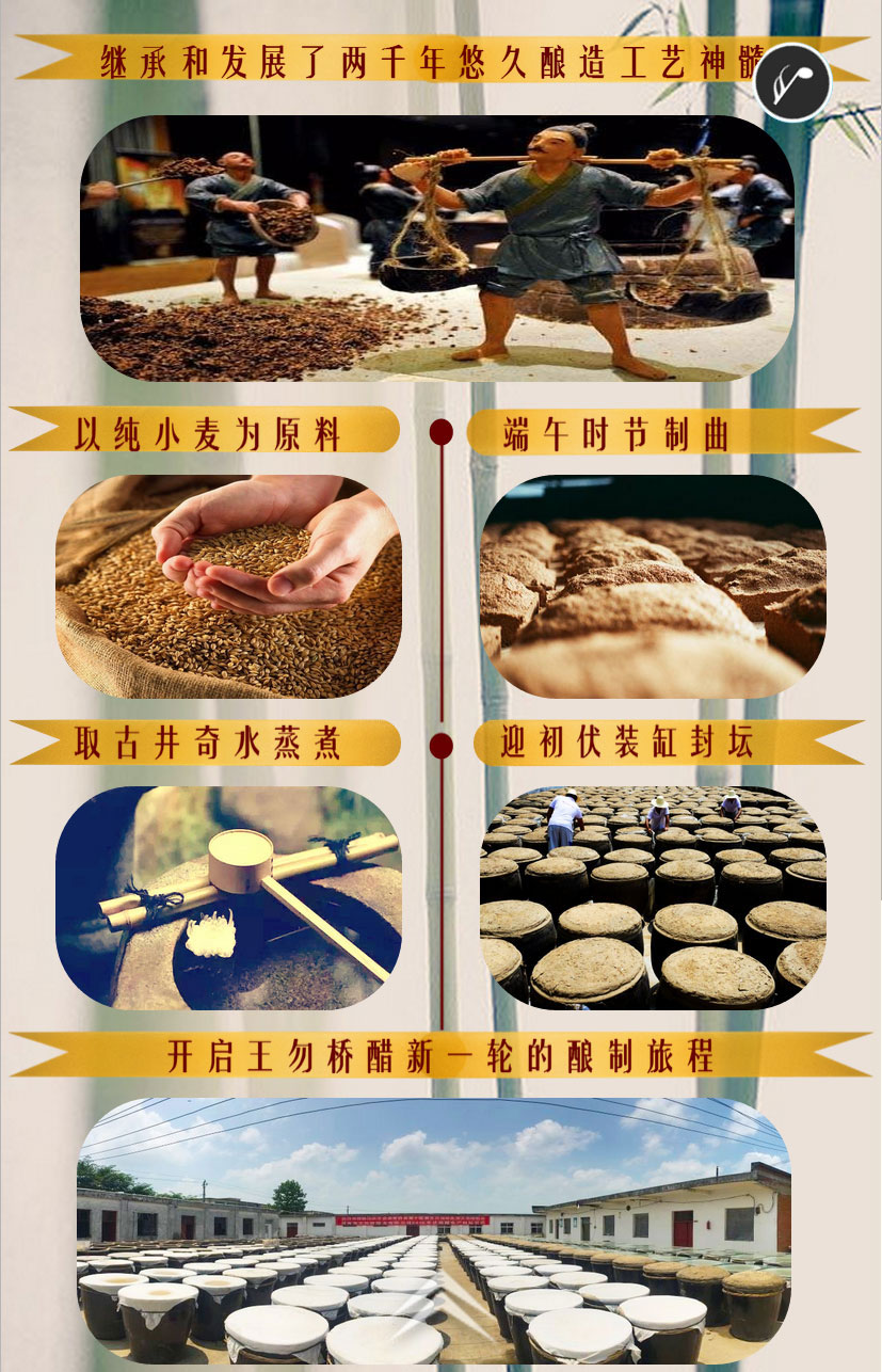王勿桥醋继承和发展了二千年悠久酿造工艺精髓:以小麦为原料、端午时节制曲、取古井奇水蒸煮、迎初伏装缸封坛