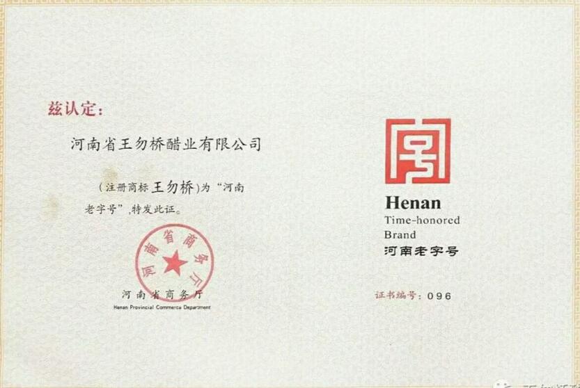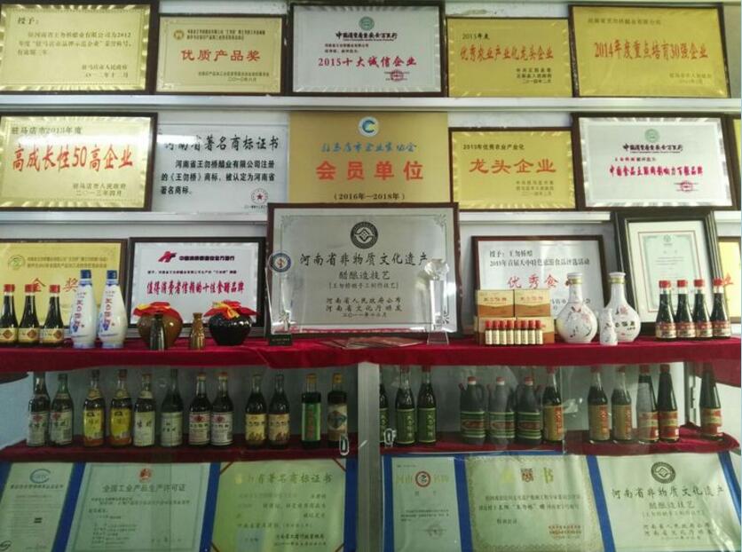作为河南省酿造学会、调味品工业行业协会常务理事单位。河南省王勿桥醋业有限公司先后获得2015年度中国“十大诚信企业”、“河南省质量管理先进企业”、“河南省百佳诚信示范企业”、2015年度“市长质量奖”、“驻马店市优秀农业产业化重点龙头企业”等80多项荣誉。