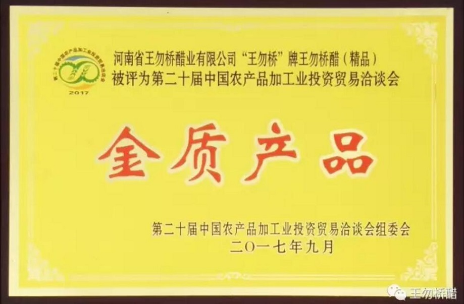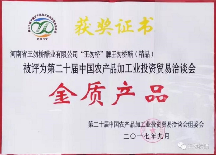 其参评的“王勿桥”牌精品醋,独具:深褐清晶、浓香醇厚、酸而不涩、香而微甜、营养丰富、久存不腐、愈存愈香等特点,一举荣获“第二十届中国农产品加工业投资贸易洽谈会金质产品奖”。