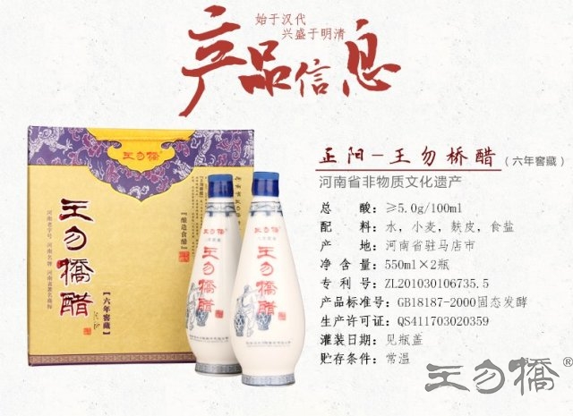 王勿桥醋为历史名醋,相传源自汉代,盛于明清。据康熙年间《正阳县志》记载,“王勿桥醋用井水酿造,气味芳醇,超山、陕出品,并能疗病伤……”。其酿造技术由醋师世代相袭,配方秘而不宣。王勿桥醋以优质小麦为原料,用古井水迎初伏,由制醋名师净身更衣,焚香祭拜,精制入缸。经140个日晒夜露,自然发酵而成。成品再入地窖,存放3—5年方食用。该醋具有深褐清晶,浓香厚醇,酸而不涩,香而微甜,营养丰富,久存不腐等特点。
