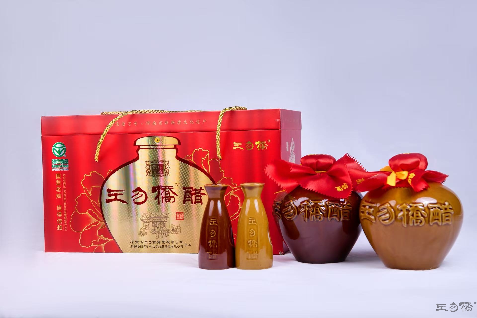 王勿桥醋为历史名醋,相传源自汉代,盛于明清。据康熙年间《正阳县志》记载,“王勿桥醋用井水酿造,气味芳醇,超山、陕出品,并能疗病伤……”。其酿造技术由醋师世代相袭,配方秘而不宣。王勿桥醋以优质小麦为原料,用古井水迎初伏,由制醋名师净身更衣,焚香祭拜,精制入缸。经140个日晒夜露,自然发酵而成。成品再入地窖,存放3—5年方食用。该醋具有深褐清晶,浓香厚醇,酸而不涩,香而微甜,营养丰富,久存不腐等特点。